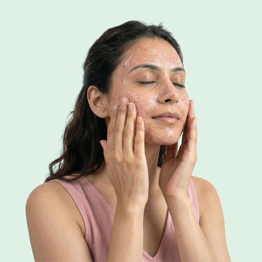 A gentle exfoliating scrub crafted with Alpha Arbutin 1%, Negin Saffron, Gheru, Manjistha Powder, Red Nagakesar, Sandal Powder, and finely milled Walnut & Almond Shells.