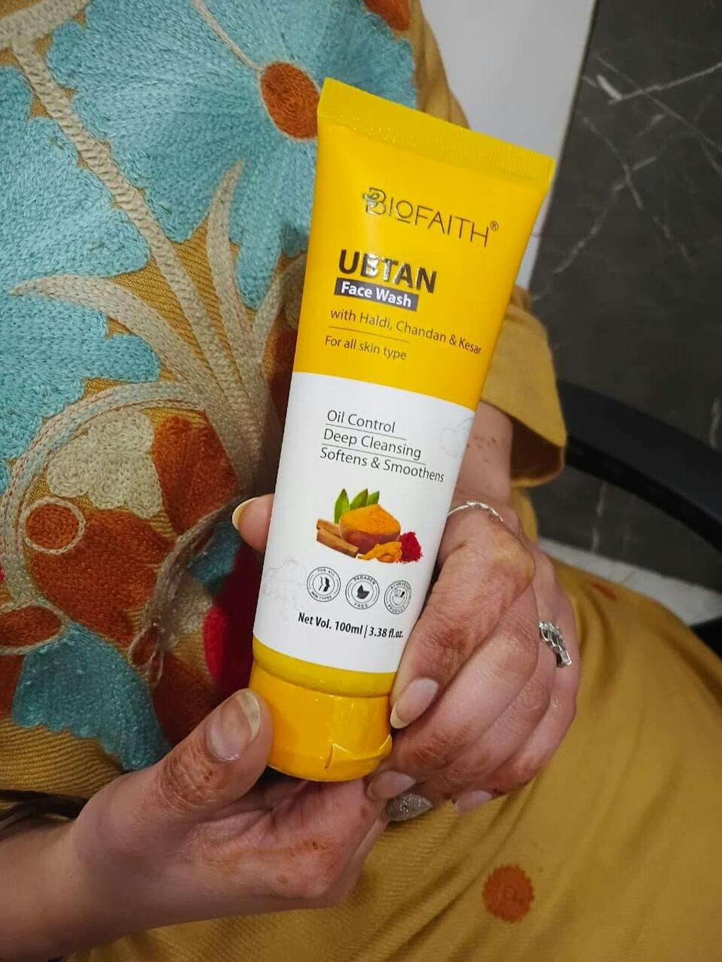 - Take a sufficient quantity of Biofaith Ubtan Face Wash in your palm.